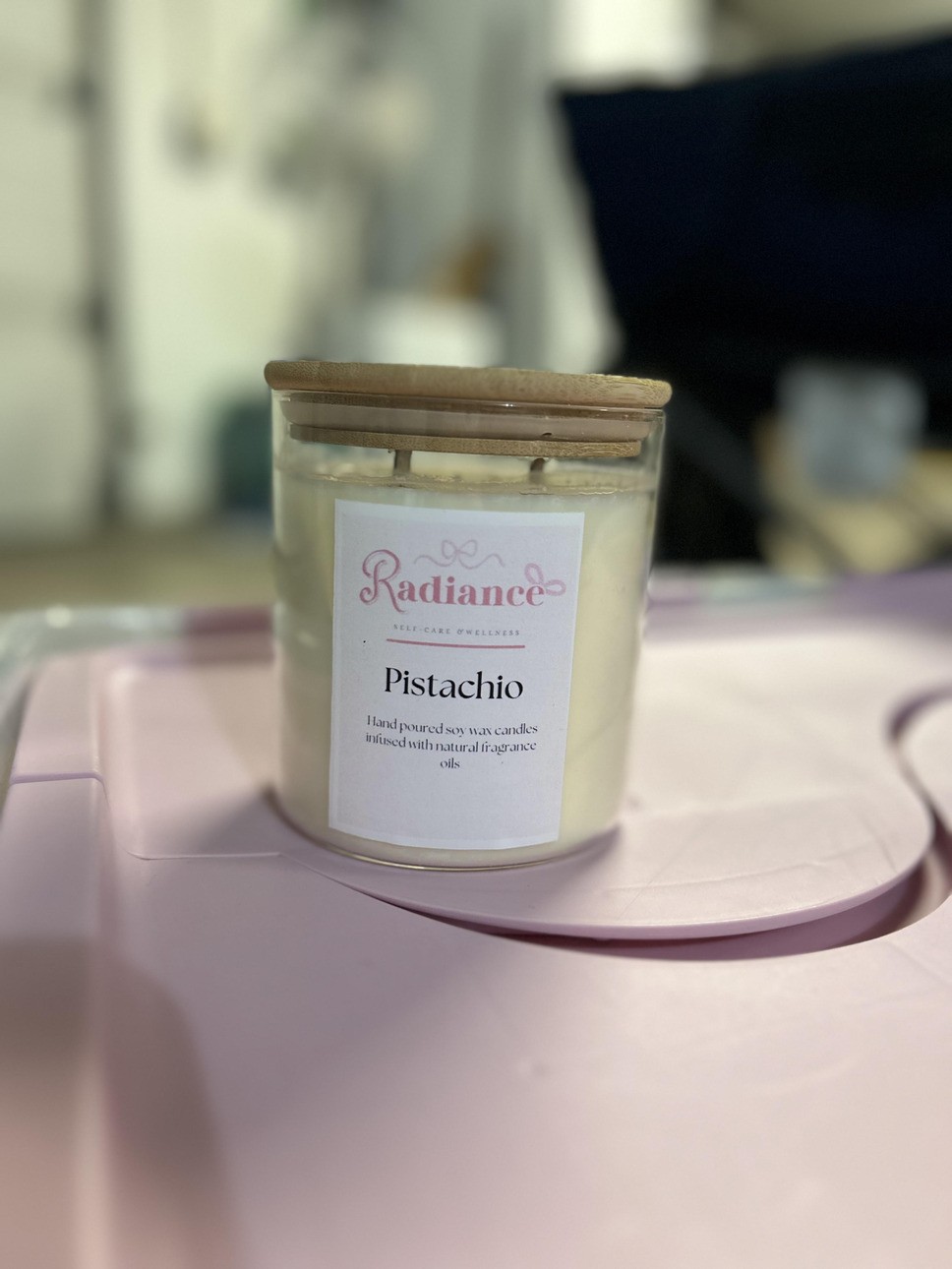 Her personal favourite, and the bestseller at every market she attends, the Pistachio candle is everything Radiance Wellness is in one jar. It's made with 100% natural soy wax — something she made a deliberate choice about early on, because she cared too much about what people were burning in their homes to cut corners. Inside, a wooden wick crackles softly as the candle burns, the way a fireplace does, the way rain does — a sound that immediately slows you down. The wooden wick also means a longer burn: up to 40 hours for the medium 10 oz jar.